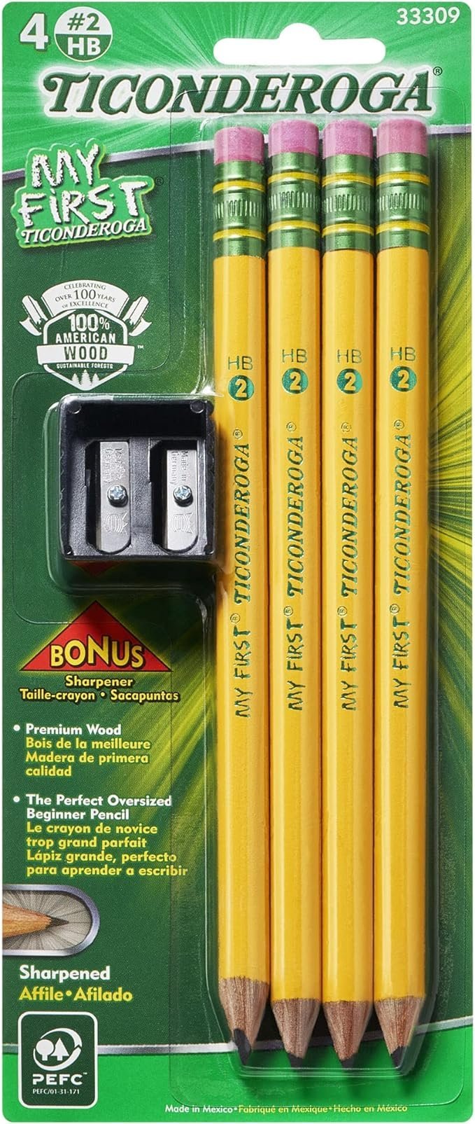 Ticonderoga My First Wood-Cased Pencils, Pre-Sharpened, 2 HB, With Sharpener, Yellow, 4 Count